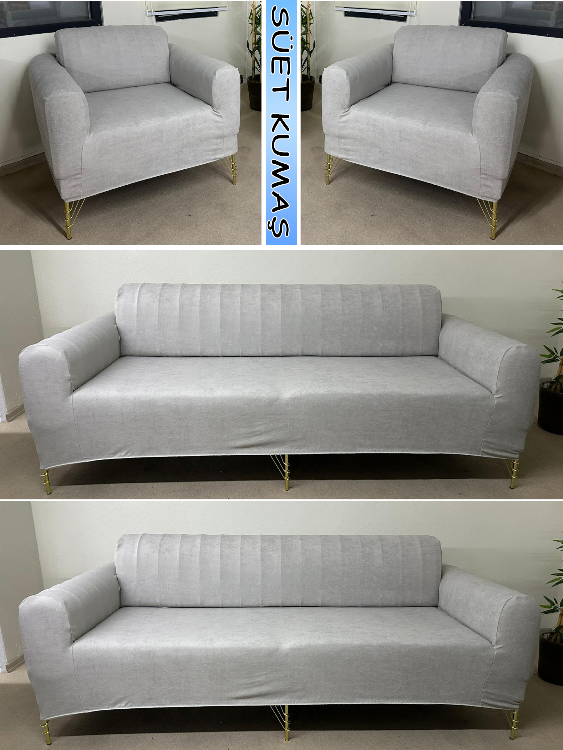 AÇIK GRİ SÜET KUMAŞ 3+3+1+1 SET KOMPLE GİYDİRME KOLTUK KILIFI KANEPE,ÇEKYAT,BERJER